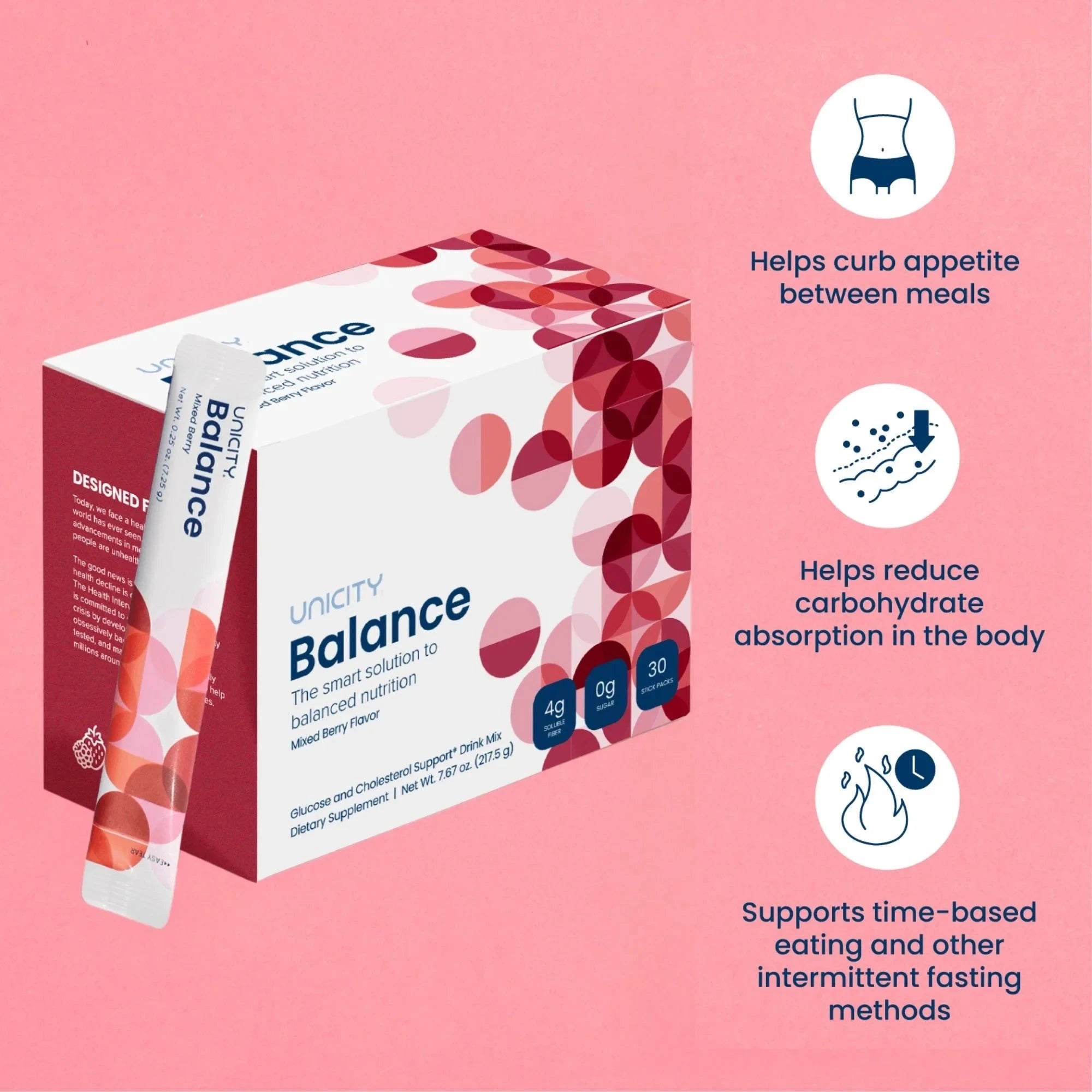 Balance, vor den Mahlzeiten eingenommen, liefert eine patentierte Fasermatrix, die bioaktive Pflanzenstoffe, Polysaccharide und Mikronährstoffe enthält.